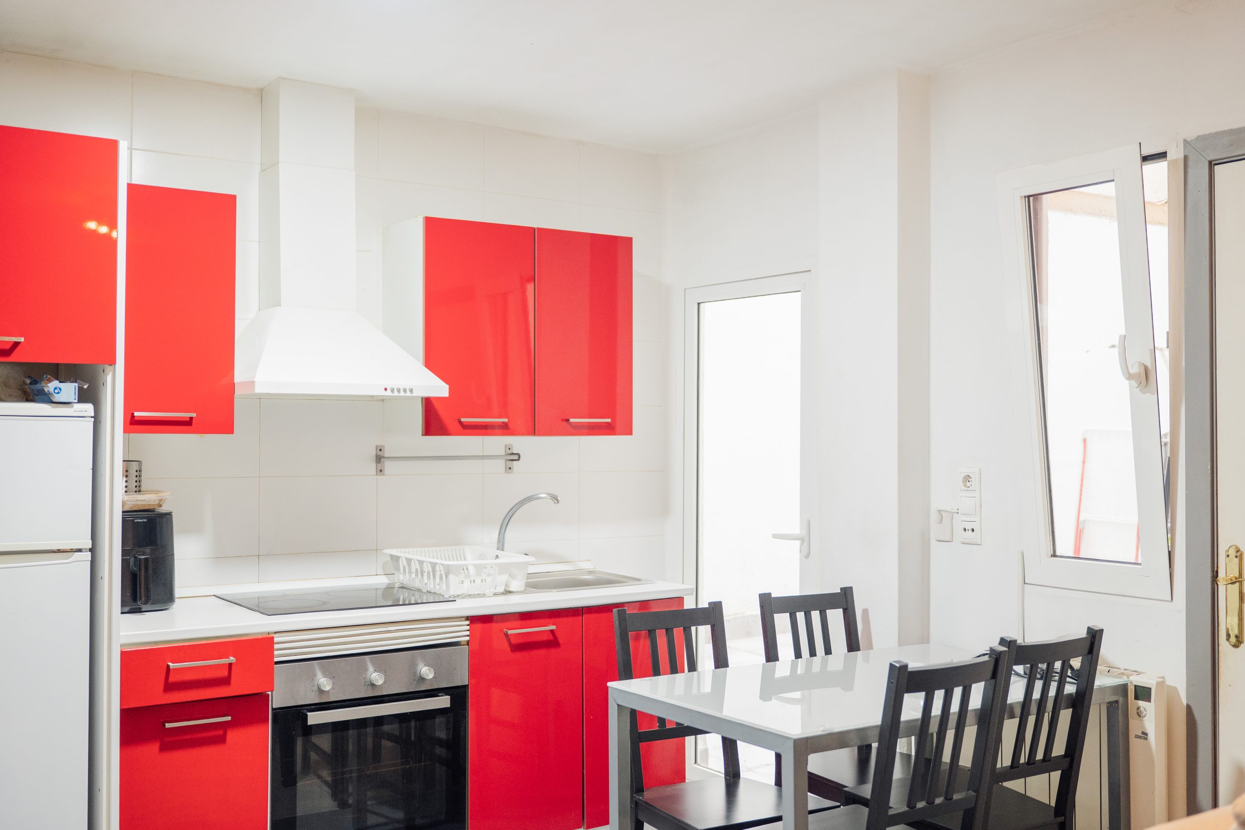 Cocina moderna y funcional: Con un diseño atrevido y contemporáneo, la cocina cuenta con muebles en rojo brillante que le dan un aire vibrante. Está completamente equipada con electrodomésticos (horno, vitro, extractor, frigorífico) y tiene una zona de comedor para 4 personas, perfecta para compartir buenos momentos.
